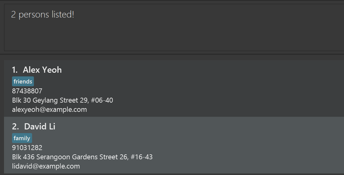 edit 1 p/91234567 e/johndoe@example.com Edits the phone number and email address of the 1st person to be 91234567 and johndoe@example.com respectively.edit 2 n/Betsy Crower Edits the name of the 2nd person to be Betsy Crower.findFinds persons whose names contain any of the given keywords.